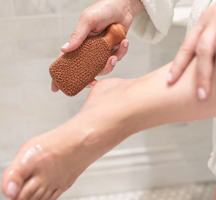 - At the end of your shower or bath, add a few drops of liquid soap to the Foot Scrubber and gently scrub feet. Focus on especially dry or callused areas, such as heels, balls of feet and toes.